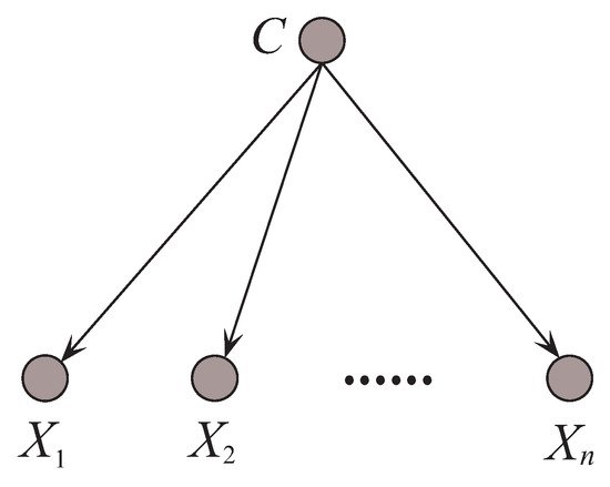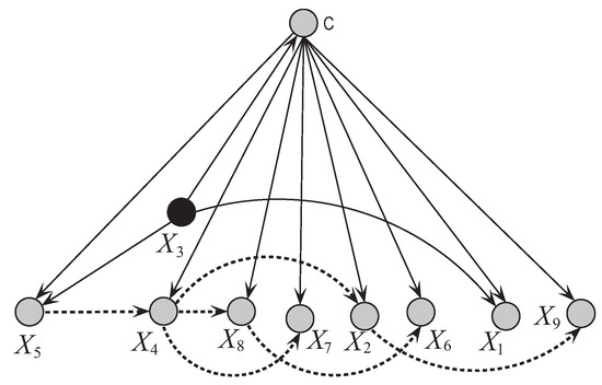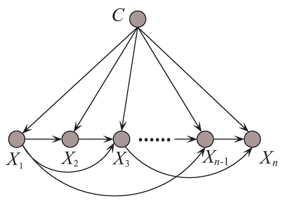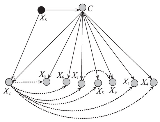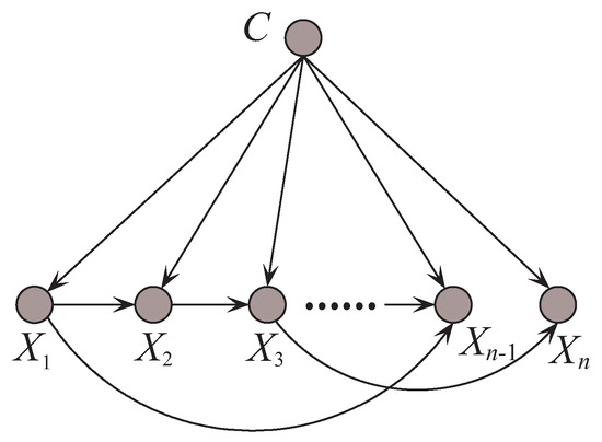 where are the j parent attributes of in the structure, where . KDB can represent conditional dependencies. When , KDB represents the same number of conditional dependencies of TAN. As k increases, KDB can represent increasingly conditional dependencies. Figure 5 shows an example of KDB when k = 2.