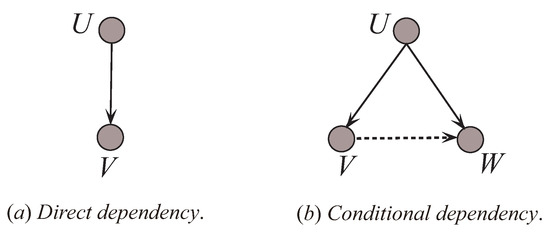 Generally, as Figure 7 shows, dependency types in BNCs can be divided into two types: one is the direct dependence relationship (indicated in the Figure 7a by the solid line), such as the relationships between variables U and V; another is the conditional dependence relationship (indicated in the Figure 7b by the dotted line), such as the relationships between variables V and W given U. To interpret the effect of dependency types to UKDB, a simulation study has been carried out on dataset WBC.