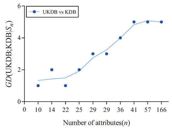 We compared the proposed algorithm when with several benchmark classifiers [12,13,23] that were presented in the literature. The statistical results of all evaluated functions using 20 rounds of 10-fold cross validation are shown in Table 5. For each fold, 9/10 of the data was used for training and 1/10 of the data was used for testing. In addition, all experiments have been conducted on a desktop computer with an Intel(R) Xeon(R) CPU X5680 @ 3.33GHz, 64 bits and 8192 MiB of memory. In addition, for training data, missing values for qualitative attributes are replaced with modes and those for quantitative attributes are replaced with means from the training data [35,36,37]. In addition, for testing data, UKDB proposes a natural way for dealing with missing values, not considering the dependence relationships related to missing values. The negative effect caused by missing values for UKDB can be mitigated by removing noisy dependence relationships, and the learned network structure may be more robust.