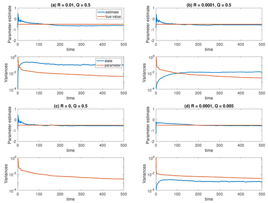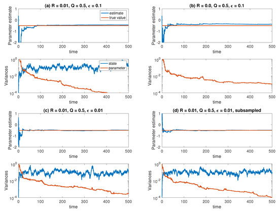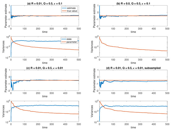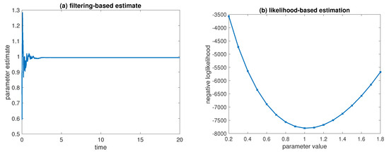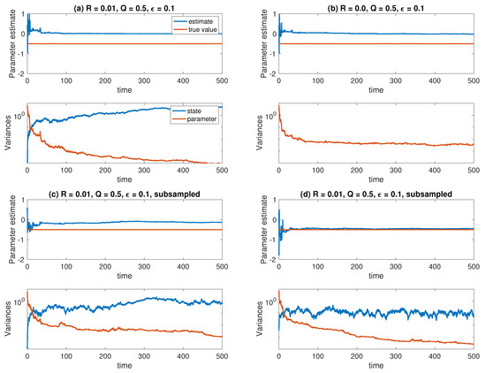 leads to in the limit and the observation interval . This MLE corresponds to and in our extended state space formulation of the problem. Subsampling can be achieved by choosing an appropriate time-step in the ensemble Kalman–Bucy filter equations and a corresponding subsampling of the data points in (88). We used and , respectively. The results can be found in Figure 4. It can be seen that only the larger subsampling leads to a correct estimate of the parameter a. This is in line with known results for the maximum likelihood estimator (90). See [32] and references therein.