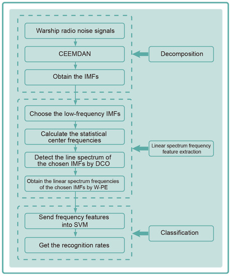 According to the theoretical analysis of CEEMDAN, DCO, and W-PE, a novel linear spectrum frequency feature extraction technique for warship radio noise is presented, named CEEMDAN-DCO-W-PE. The flow chart of CEEMDAN-DCO-W-PE is shown in Figure 2. The specific steps of the linear spectrum frequency feature extraction technique are as follows: