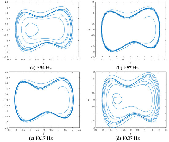 We use DCO to detect the line spectrum of IMFs from low-frequency IMF to high-frequency IMF based on the statistical center frequency of IMFs by CEEMDAN. The results show that there is no line spectrum in IMF8 and IMF9; the first line spectrum is in IMF7. Figure 5 is the phase space tracks of IMF7 under different driving force frequencies. As seen in Figure 5, the phase space tracks are under great periodic stage with the driving force frequencies of 9.97 Hz and 10.17 Hz. We calculate the PEs and W-PEs of the DCO outputs under great periodic stage with different driving force frequencies. Table 2 is the complexity distribution of IMF7 under different driving force frequencies. As seen in Table 2, the minimum values of PE and W-PE correspond to the frequency of 9.95 Hz and 9.98 Hz, which can reflect the real line spectrum frequency of IMF7.
