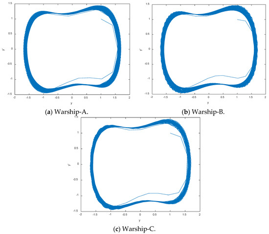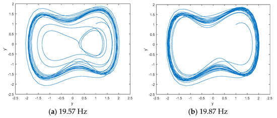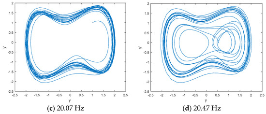 DCO is used to detect the line spectrum of IMF6 by CEEMDAN based on the statistical center frequency of 19.87 Hz. Figure 6 shows the phase space tracks of IMF6 under different driving force frequencies. As seen in Figure 6, the phase space tracks are under great periodic stage with the driving force frequencies of 19.87 Hz and 20.07 Hz. We calculate the PEs and W-PEs of the DCO outputs under great periodic stage with different driving force frequencies. Table 3 is the complexity distribution of IMF6 under different driving force frequencies. As seen in Table 3, the minimum values of PE and W-PE correspond to frequencies of 19.95 Hz and 19.97 Hz, which are close to the real line spectrum frequency of 20 Hz.
