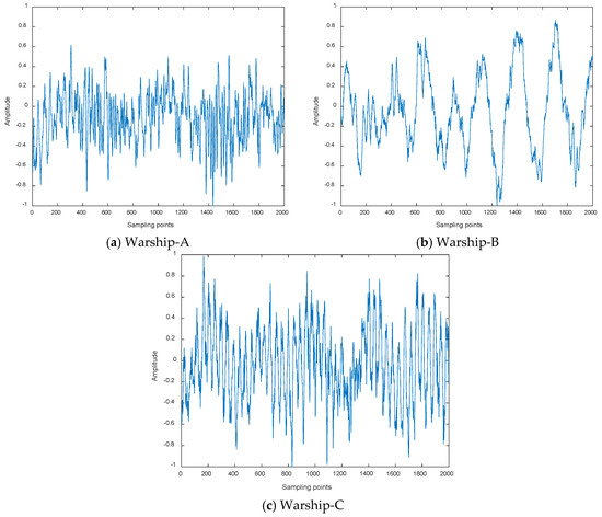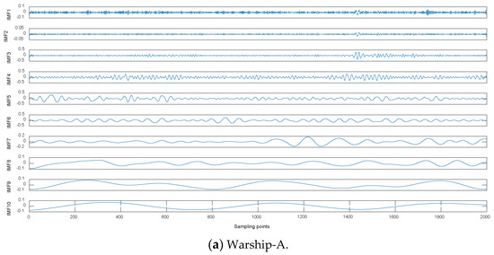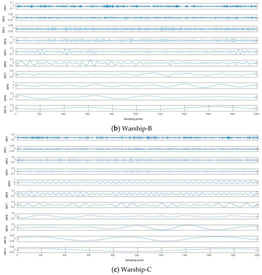 Warship radio noise source is divided into three categories: mechanical noise, propeller noise and hydrodynamic noise. Warship radio noise signals contain abundant line spectrum components, which can reflect their real physical characteristics. CEEMDAN-DCO-W-PE is carried out on warship-A, warship-B, and warship-C. We measured warship radio noise signals at level 1 sea state by hydrophones. When one of the warships is running, the other warships remain out of work. Time-domain waveforms and decomposition results by CEEMDAN for warships are shown in Figure 7 and Figure 8, respectively. As seen in Figure 7 and Figure 8, the number of sampling points is 2000 and the numbers of IMFs for warships by CEEMDAN are 10, 10, and 11. For the sake of convenience we choose the low-frequency IMF10 for the research. The frequency feature extraction results of IMF10 for warships by CEEMDAN-TCF are shown in Table 5. As seen in Table 5, the statistical center frequencies of three warship signals are different to some extent.