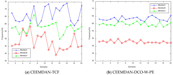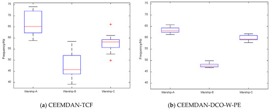 First, we extract the frequency features of 20 samples for each warship by CEEMDAN-TCF and CEEMDAN-DCO-W-PE. The frequency feature distributions and boxplots of CEEMDAN-TCF and CEEMDAN-DCO-W-PE are shown in Figure 10 and Figure 11. As seen in Figure 10 and Figure 11, for the same warship signals, the frequency features by CEEMDAN-TCF have a larger fluctuation range than the ones by CEEMDAN-DCO-W-PE.