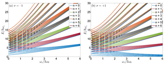The energy spectrum of Equation (6) is presented in Figure 1 for and . It is interesting to note that, for high magnetic fields , things simplify in Equation (6) and we get the following expression: