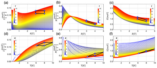 Classical thermodynamic quantities entropy , internal energy and magnetization as a function of: external magnetic field (B) (a–c); and temperature (T) (d–f). In (a–c), the colors blue to red represent temperatures from K to 10 K, respectively. For (d–f), the colors blue to red represent lower to higher external magnetic field, from T to 5 T. The value of the parabolic trap is approximately to 1.7 meV. Additionally, we show how the Otto cycle appears in terms of the thermodynamic quantities considered.