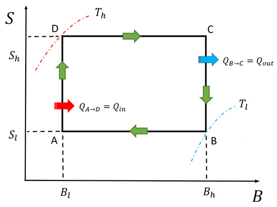 It is important to mention that the cycle operation in the counter-clockwise form starting at Point A described in Figure 2 gives negative work extracted, thus, to define a thermal machine correctly, we start the cycle at Point B, and we go through it in a clockwise direction. This is due to the particular behavior of the entropy as a function of magnetic field and temperature in the chosen zone marked with A, B, C and D. Therefore, the cycle described in the next subsection is the form of and is presented in Figure 3.