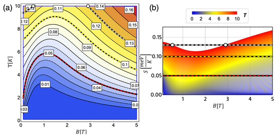 The condition given by Equation (21) (or Equation (22)) for the classical cycle give us information about the behavior of the external magnetic field and the temperature in the adiabatic stroke. In Figure 4a, we can appreciate the level curves of the entropy function and, Figure 4b shows some examples of isentropic strokes in a plot of vs. B for different temperatures. That example shows three cases of constant low (red-black curve, ), medium (yellow-black curve, ) and high (white-black curve, ) entropy. We observe in Figure 4a that there is a zone where the external field grows with the temperature of the sample and a zone where the opposite happens to maintain the entropy constant. At low working temperatures, the behavior changes near T, while as the temperature increases, the slope change occurs at higher values of the magnetic field, approaching T. Secondly, if we observe Figure 4b showing the case for (white-black line), we have a restricted area for field values lower to 3 T if we work with a maximum temperature of 10 K. Therefore, the movement of the magnetic field is not arbitrary if we think in a thermodynamic magnetic Otto cycle with two temperature reservoirs fixed at some specific values, more specifically, the reservoir associated to the hot temperature in the cycle. In addition, Figure 4 is the solution of constant, obtained from the differential Equation (21) with different conditions (i.e., distinct values of the constant value of S). Therefore, Figure 4a depicts the entire family of solutions for the isentropic stroke of the engine of this particular system.