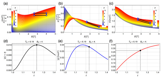 Due to the change of behavior in the entropy as a function of the external field, we obtained very interesting results for when we explored the zone close to T. Before that point, the entropy decreases as function of the external field and after that point entropy begins to increase. This fact can be used to explore the magnetic cycle in that zone finding an oscillatory behavior for . In Figure 6, we show the cycle with operating temperatures K and K and external magnetic field moving between T and T and, consequently, the r parameter moving from 1 to . First, we observe a decreasing efficiency for in Figure 6f with a maximum value of for . Therefore, also for this configuration, the Carnot efficiency ( for this case) cannot be reached. Comparing these results with those previously discussed (when we avoid this particular region), we can see in Figure 5f that the efficiency asymptotically approaches to the efficiency of Carnot if we increase the intensity of the external magnetic field of the starting point of the cycle (Point B).