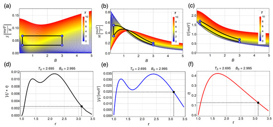 Figure 5e shows different values of total work extracted varying the value of from 4 T to T. This variation in the external field is reflected in the movement of r in the form of . Therefore, r is in the range of . The parabolic trap is fixed to the value of 1.7 meV and the effective mass in the value of . In particular, Figure 5a–c shows the exact paths for the magnetic cycle for the maximum point obtained when multiplying (Figure 5e) and the efficiency (, Figure 5f). That point corresponds to (black point in Figure 5d–f) and constitutes the best configuration of the systems to obtain the best with the better through the cycle. In addition, and are presented in Figure 5e,f for the optimal value of r parameter mentioned before. We observe that obtained for that point is in the order of ∼0.038 meV with an efficiency of . We have corroborated the numeric result of total work extracted using the area enclosed by the cycle in Figure 5b of M versus B, as the work is [50,51,52] when the parameter changed during the operation of the engine in the external field. On the other hand, to obtain the solid lines presented in Figure 5d–f, we needed to make different cycles configuration keeping the values of the isothermal fixed as can be appreciated in the Supplementary Materials (see the link after Section 5), made with the Mathematica software [55], where we show each shape that the cycle must have to generate a specific point of work. It is important to recall that we never reach the optimal value of , i.e., the Carnot efficiency.