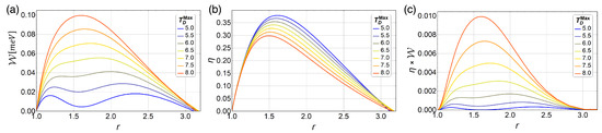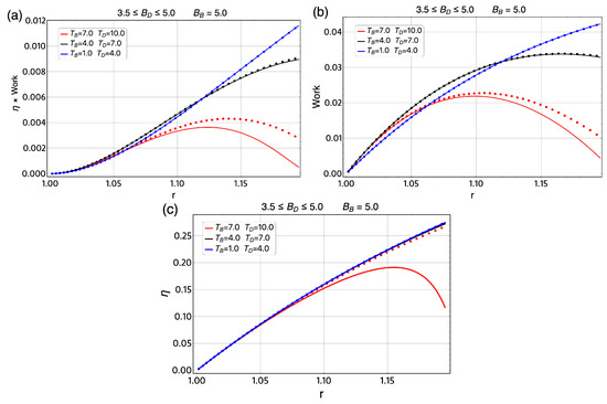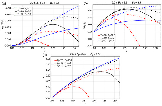 (a); and total work extracted (b,c) efficiency for the case of for different regions of temperature parameter. For all cases, we use the initial external magnetic field at the value of T and the minimum value of the field, moves between T and T. Therefore, the r parameter moves between . The parabolic trap is fixed to the value of 1.7 meV and the effective mass value of .
