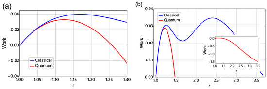 Next, we show the results of the evaluation of the quantum version of this magnetic Otto cycle for the same cases shown in Figure 5 and Figure 6. In Figure 8a, we plot the classical work (blue line) and the quantum work (red line) for the same sets of parameters in Figure 5. First, we note that the classical and quantum work are equal up to the value of . This means, for values close to the starting external magnetic field to Point B, we do not notice a difference between the classic and quantum formulation of the Otto cycle. As shown in Figure 8a, we found a transition from positive work to negative work not reflected in the classic scenario close to .