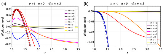In Figure 9, we present the work W per energy level and spin value for the most important values of our numerical calculations. We used the same parameter as in Figure 8b. We observed that the contribution given by are positive up to r close to being the energy levels , and those that contribute with the most positive values. Contrarily, for the case of , we found that all contributions per energy level are negative. Therefore, the small region of positive work found in Figure 8b can only be associated to the spin up () contributions.