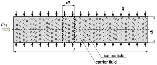 Assuming a homogenous single-dimensional flow of the ice slurry mass flux in a horizontal pipe (Figure 1), the first and second principle of thermodynamics for the dl test section may be described using Equations (1) and (2), respectively: