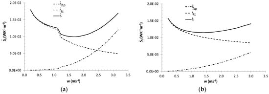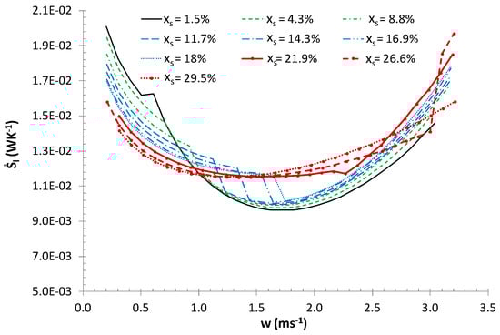 In the studied range of flow velocities 0 ≤ w ≤ 3 ms−1 for an ice content greater than xs > 21.9%, the flow is laminar in nature, and the ice slurry flow resistance values are moderate, while the presence of solid particles favors the highest values of heat transfer coefficients [,]. In this case, entropy generation is determined by the irreversibility of the thermal processes. For low mass fractions of ice, obtaining suitably high values of heat transfer coefficients depends not only on the presence of solid particles, but also on the appropriate value of flow velocity. As a consequence, this leads to a change into the turbulent flow area, where, in turn, flow resistance values have a significant impact on the induction of the total entropy generation. It also needs to be noted that large mass fractions of ice (xs > 20%) are typically associated with a relatively large range of velocities, for which the total entropy generation rate is at its minimum. This results from the dominant impact of solid particles and phase change, but not flow velocity, on heat transfer coefficients []. The calculations made for various heat flux densities and pipe diameters made it possible to determine for specific mass fraction of ice, the flow velocities for which the total entropy generation rate was at its minimum.