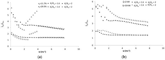 The analysis of Equations (6)–(12) and calculation results presented in Figure 2; Figure 3 indicate that in case of non-adiabatic ice slurry flow, the generated entropy flux is determined by flow velocity, mass fraction of ice, heat flux density and tube diameters. It should also be noted that the mass fraction of ice, flow velocity and diameter determine the nature of the flow of the agent. With the increase in the Reynolds number, the effects of particulate matter on the heat transfer coefficients decreases and a greater influence of flow phenomena on the generated entropy fluxes is observed. Therefore, in the turbulent flow area, the entropy flux depends more on flow velocity and diameter than mass fraction of ice and heat flux density. Small tube diameters imply higher values of heat transfer coefficients and low values of the entropy flux generated by the heat exchange process. In general, lower tube diameters correspond to lower total values of the entropy flux. The results presented in Figure 4a,b indicate that in the laminar flow area, the effect of tube diameter on entropy flux is particularly significant: for . In the turbulent flow area where the values of the Bejan numbers are high (Be > 0.5) the ratio stabilizes at = 1.34–1.4 and = 2.7–3.7 for = 1.6 and = 2, respectively.