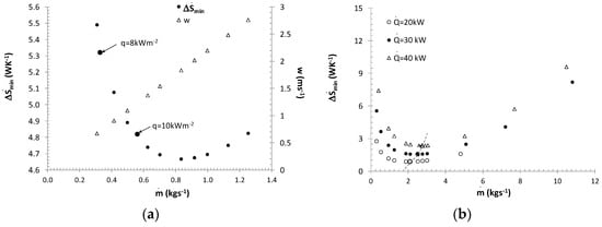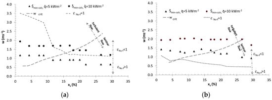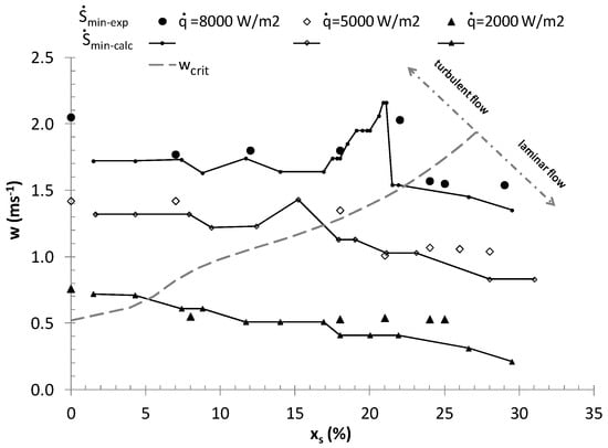 The experimental values of w and xs were determined by calculating, at each measurement point, the entropy generation rate (Equation (6)) using the measured values of heat transfer coefficients and the flow resistance values [,]. Next, for the given values of xs, the measurement points were chosen at which and the non-monotonic course of the relationship w(xs)Smin was associated with an area of transition between laminar and turbulent flow. The plotted theoretical curves provide a qualitatively correct description of the course of analogous curves obtained directly from the measuring points. The mean relative difference between the experimental and analytical flow velocities does not exceed 7.6%. The maximum difference between the measured velocities and the calculated velocities concerned the case of heat flux density = 2 kW and was lower than 30%.