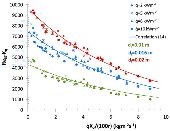 All analyzed parameters (xs, di, w, ) are independent, but they affect the heat transfer coefficients and flow resistance, and thus the entropy flux and its minimum value, in various ways. Charts similar to the one presented in Figure 5 allow the selection of parameters xs, (Xv Table 1) w, di, in such a way that the entropy flux generated by the ice slurry is minimal. The results presented in Figure 5 and similar results for tube diameters di = 0.01 m and di = 0.02 m can be presented in the form of criteria relationship (14). Correlation (14) defines the relationship between the Reynolds number and dimensionless numbers taking into account the effect of geometric (KqX) and flow parameters (Kq, KqX) on the generated minimal entropy flux.