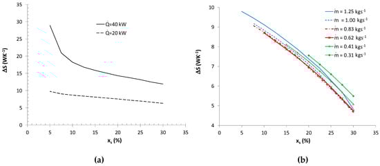 Figure 2 suggests that in the laminar flow area, the lowest entropy generation rates correspond to the maximum fraction of ice in the ice slurry. However, let it be noted that in the entire flow area, the lowest entropy generation rates correspond to low mass fractions of ice xs < 10% and the minimum value of the entropy generation rate is recorded in the turbulent flow area. This is related to the mutual relationship between entropy generation in thermal and flow processes (Figure 3).