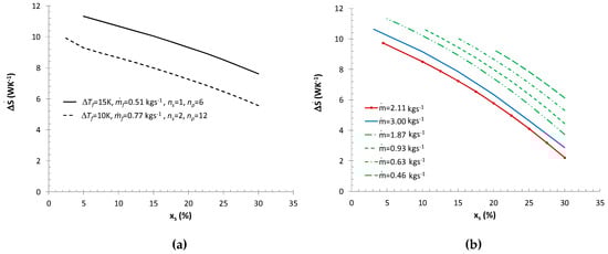 Relationship between entropy generation rates , for di = 0.016 m, kWm−2: (a) xs = 11.7%; (b) xs = 26.6%.