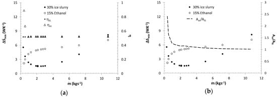 The large mass fraction of ice makes it possible to limit the mass flux of the refrigerant and the heat exchange surface area of ice slurry-fed heat exchangers. Without a doubt, ice particles enhance the heat transfer process. The efficiency of ice slurry use as a refrigerant can be determined on the basis of the criteria commonly used in heat transfer. The obvious indicators of the efficiency of various methods used to improve heat exchange conditions include the heat transfer coefficient enhancement ratio (εh = h/href) and the flow resistance increase ratio (). The mutual relationship between εh and εΔp is expressed as their quotient (εh−Δp = εh/εΔp) [], or the so-called overall enhancement efficiency, defined as εNu−f = (Nu/Nuref)/(f/fref)1/3 [,]. The use of the second principle of thermodynamics in design is based on an analysis of the entropy generation rate, which enables a quantitative determination of the irreversibility of the analyzed thermal and flow process. It is common practice to use the entropy generation rate for the thermo-dynamic assessment of thermal and flow processes and as an optimization criterion, for example, in the design of heat exchangers. Also used are complex criteria for the assessment of efficiency—a combination of the performance evaluation criteria and the entropy generation minimization (EGM) criterion []. In [], the authors propose a method for the analysis of the entropy generation rate in the design of single-phase thermal processes, heat storage systems or various thermal cycles. The method proposed by Bejan [] has been successfully used by other authors to perform a thermodynamic assessment of thermal processes during single-phase flows [,], multi-phase flows [,,,,,], heat exchange involving non-Newtonian fluids [,,] and design of thermal systems and exchangers [,,,,,,,,].