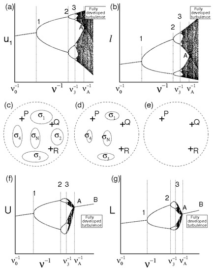 Figure 1 qualitatively shows the route from non–chaotic regimes toward the developed turbulence. Specifically, Figure 1a,b report two bifurcation maps at a given instant, providing the velocity component in a point of the space and one characteristic scale ℓ of the velocity field in function of . Figure 1c–e symbolically represent, for assigned values of , the velocity field set (points inside the dashed circle), three different solutions of the Navier–Stokes equations—say P, Q and R—and the several subsets , ,… which correspond to islands that are not swept during the fluid motion. The figure also depicts L= and U= (Figure 1f,g), formally calculated with Equation (7). Following Equation (16), these maps are not universal, as = , , L = and U = do not represent universal laws and their order of magnitude will depend on velocity field at . When , the number of solutions diverges and the bifurcation tree of and ℓ drastically changes its structure showing tongue geometries that develop from the different bifurcations. As long as does not exceed much , the extension of such tongues is relatively bounded, whereas the measure of the islands is quite large. This means that, although and ℓ exhibit chaotic behavior there, these do not sweep completely their variation interval, thus Equation (4) do not behave like an ergodic dynamic system there. This corresponds to Figure 1c, where the velocity fields P, Q and R, being differently placed with respect to , will exhibit different values of average kinetic energy and dissipation rate in . As rises, these tongues gradually increase their extension whereas the measures of diminish (see Figure 1d) until reaching a situation in which the bifurcation tongues overlap with each other and the islands vanish (Figure 1e). Such developed overlapping corresponds to the chaotic behavior of and ℓ, where these latter almost entirely describe their variation interval: Equation (4) behave like an ergodic dynamic system there, whereas all the velocity fields, in particular P, Q, and R, although different to each other, give the same values of average kinetic energy and dissipation rate in . This is the onset of the fully developed turbulence.