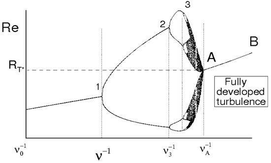 If does not exceed its critical value, say , the velocity fields satisfying Equation (15) are limited in number and this corresponds to the intermediate stages of the route toward the chaos. On the contrary, when , the region of developed turbulence where 0 is observed, being the average maximal Lyapunov exponent of the Navier–Stokes equations, is formally calculated as