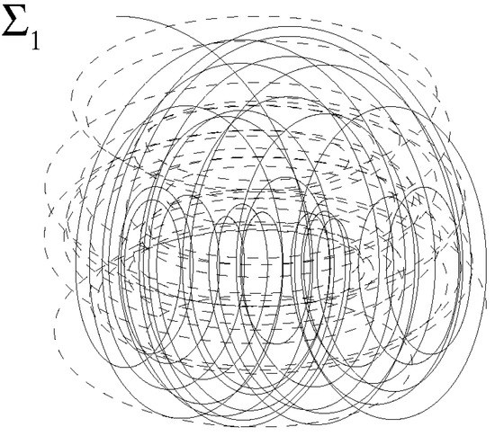 defines the surface . Thus, the points which satisfy both the conditions (22) and (24) belong to the line , and represent all the possible kinematic bifurcations which could happen along . Because of fully developed turbulence, will also show nonsmooth spatial variations and will tend to describe the entire physical space. Therefore, the kinematic bifurcations that occur along are obtained as , being . As and are two different curves of the same surface that exhibit chaotic behaviors, their intersections are expected to be very frequent, forming a highly numerous set of points on according to the qualitative scheme of Figure 3 wherein and are represented by solid and dashed lines. Specifically, for > , 0, the Navier–Stokes bifurcations produce the regime of fully developed turbulence, where length scales and velocity values are continuously doubled and this causes situations where the number of the intersections between and (kinematic bifurcations) diverges. To show this, the kinematic bifurcation rate is now introduced. This quantity, calculated along a fluid particle trajectory, is defined as follows: