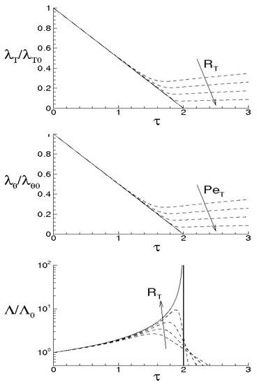For one assigned velocity field, from Equations (25) and (26), the simultaneous values of and can cause very frequent kinematic bifurcations whose rate can be significantly greater than the maximal Lyapunov exponent of Equation (19) or (20). In fact, following Equations (25) and (26), the order of magnitude of identifies the ratio (large scale velocity)–(small scale length)