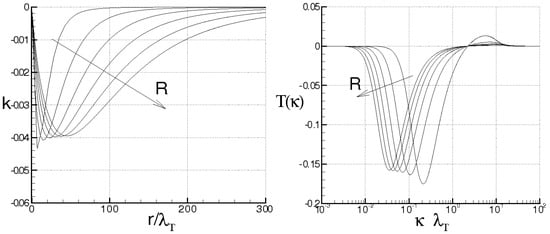 The von Kármán–Howarth and Corrsin equations are the evolution equations of longitudinal velocity and temperature correlations in homogeneous isotropic turbulence, respectively. Both the equations, being unclosed, need the adoption of proper closures [17,18,19,20]. In detail, the von Kármán–Howarth equation includes K, the term due to the inertia forces and directly related to the longitudinal triple velocity correlation k, which has to be properly modelled. The modeling of such term must take into account that, due to the inertia forces, K does not modify the kinetic energy and satisfies the detailed conservation of energy [18]. This latter states that the exchange of energy between wave–numbers is only linked to the amplitudes of such wave–numbers and of their difference [21]. Different works propose for the von Kármán–Howarth equation the diffusion approximation [22,23,24]