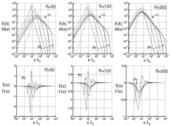 For what concerns the Corrsin equation, this exhibits G, the term responsible for the thermal energy cascade. This quantity, directly related to the triple velocity–temperature correlation , also needs adequate modellation. As G depends also on the velocity correlation, the Corrsin equation requires the knowledge of f, thus it must be solved together to the von Kármán–Howarth equation. Different works can be found in the literature which deal with the closure of Corrsin equation. Some of them study the self-similarity of the temperature correlation in order to analyze properties and possible expressions for G. Such studies are supported by the idea that the simultaneous effect of energy cascade, conductivity and viscosity, makes the temperature correlation similar in the time. This question was theoretically addressed by George (see [25,26] and references therein) which showed that the decaying isotropic turbulence reaches the self–similarity, while the temperature correlation is scaled by the Taylor microscale whose current value depends on the initial condition. More recently, Antonia et al. [27] studied the temperature structure functions in decaying homogeneous isotropic turbulence and found that the standard deviation of the temperature, as well as the turbulent kinetic energy, follows approximately the similarity over a wide range of length scales. There, the authors used this approximate similarity to estimate the third–order correlations and found satisfactory agreement between measured and calculated functions. On the other hand, the temperature correlation can be obtained using proper closures of von Kármán–Howarth and Corrsin equations suitable for the energy cascade phenomenon. On this argument, several articles has been written. For instance, Baev and Chernykh [28] (and references therein) analyzed velocity and temperature correlations by means of a closure model based on the gradient hypothesis which relates pair longitudinal second and third order correlations, by means of empirical coefficients.