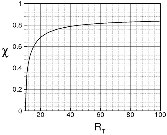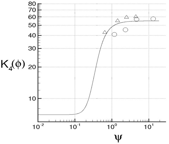 where , and are calculated using Equation (141). Figure 12 shows in function of , and compares the values calculated with the present theory (solid line), with those obtained by [73] through the nonlinear large–eddy simulations (symbols). The comparison shows that the data are in qualitatively good agreement. In more detail, for , 55, whereas the results of Reference [73] give a value of around 60. This difference could be due to the fact that the present analysis only considers the isotropic turbulence which tends to bound the values of the dimensionless statistical moments of and of and to the approximation of assuming the components of to be statistically uncorrelated.
