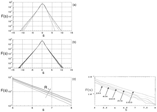where r and are separation distance and turbulent diffusion parameter, respectively and corresponds to the longitudinal velocity standard deviation. Following Equation (1), the turbulence can be viewed as a diffusivity phenomenon depending upon r, where K will include a term proportional to . In the framework of Equation (1), Hasselmann [22] proposed, in 1958, a closure suggesting a link between k and f which expresses k in function of the momentum convected through a spherical surface. His model, which incorporates a free parameter, expresses by means of a complex expression. Thereafter, Millionshtchikov developed a closure of the form , where represents an empirical constant [23]. Although both the models describe two possible mechanisms of energy cascade, in general, do not satisfy some physical conditions. For instance, the Hasselmann model does not verify the continuity equation for all the initial conditions, whereas the Millionshtchikov equation gives, following Equation (1), values of velocity difference skewness in contrast with experiments and energy cascade [18]. More recently, Oberlack and Peters [24] suggested a closure where , being a constant parameter. The authors show that such closure reproduces the energy cascade and, for a proper choice of , provides results in agreement with the experiments [24].