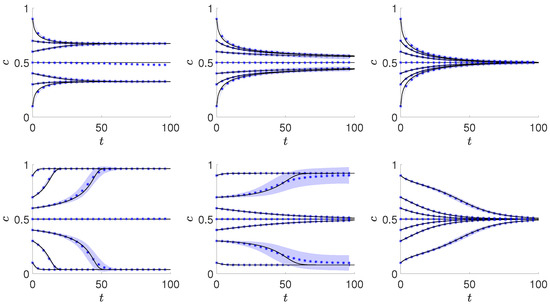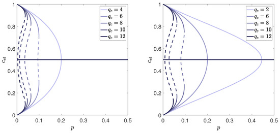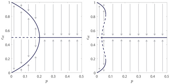 Flow diagrams for and two values of : (left panel) and (right panel), which are the same values as in Figure 1. Here solid lines denote stable steady values of concentration , whereas dashed lines denote unstable values of . Arrows denote the direction of flow, i.e., how the concentration changes in time. Supercritical pitchfork bifurcation that corresponds to the continuous phase transition is seen in the left panel, whereas subcritical pitchfork bifurcation that corresponds to the discontinuous phase transition is seen in the right panel [28,39].