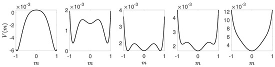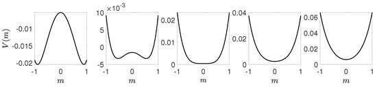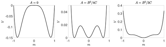Moreover, in order to obtain for real values of m corresponding to the ordered state, i.e., we also need . Therefore, the Landau theory describes continuous phase transitions only for . In Figure 4 we present a potential, given by Equation (20), for (specifically for ) and three values of A: , and . It is seen that indeed for the potential has three extrema: maximum at and two minima corresponding to . For the potential has only one extremum: minimum at . This means that for the steady state loses stability. In the next section we will show that indeed this condition is equivalent with the condition given by Equation (12).