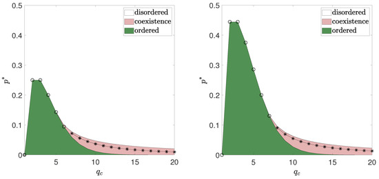 Collecting all results obtained above, we can draw the phase diagram. Examples of phase diagrams for two values of are shown in Figure 8. These diagrams remind the one for the q-voter model with independence, presented in [30]. In both cases the maximum value is obtained for , which means that agreement is more likely when the size of the group needed for conformity is of size 2 or 3 and then decreases. Moreover, for the transition becomes discontinuous. It means that hysteresis appears, i.e., there is an interval of width between lower and upper spinodal in which the final state depends on the initial one and in which both phases (agreement and disagreement) coexist with each other. In this interval both phases are metastable: for the agreement is more stable (represented by deeper minimum of the potential), whereas for the disagreement is more stable.