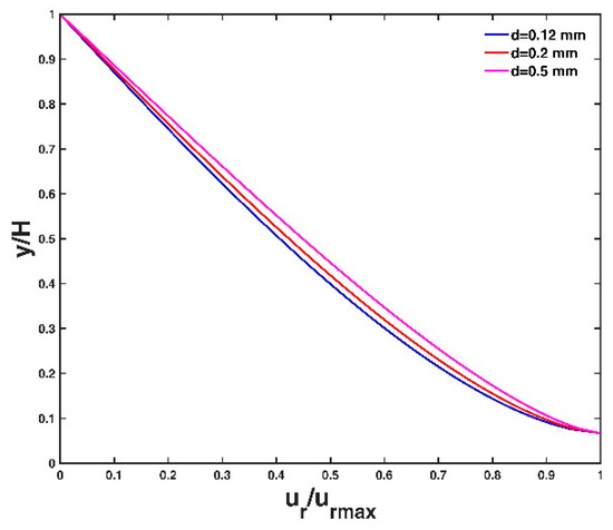 Figure 4 shows the vertical distribution of velocity lag at three different conditions of the friction velocity, , of the flow. A large flow friction velocity leads to a small velocity lag between the particle and the fluid. This is because a large friction velocity value corresponds to a strong flow shear stress, which can carry the particle well to follow the fluid velocity, and as a result, the velocity lag decreases. This agrees with the analysis results of Pal et al. [14] and Kumbhakar et al. [15]. Figure 5 shows the vertical distribution of velocity lag at three different conditions of particle diameter . The velocity lag increases with increasing particle diameter. A particle with a large diameter has a large surface area and a larger gravitational force for the same specific gravity, leading to a slower acceleration with the flow velocity, and consequently, the velocity lag increases. The vertical distribution of velocity lag at three different conditions of particle specific gravity are presented in Figure 6. The velocity lag increases with increasing specific gravity of the particle, which is inconsistent with Kumbhakar et al. [15] but consistent with the analysis result of Pal et al. [14]. A reasonable explanation is similar to the case of varying particle diameter as mentioned above: a particle with a large specific gravity value has a large gravitational force. A heavy particle is difficult for the flow to accelerate in the stream-direction compared to a light particle, thus the velocity lag increases.