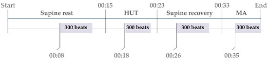 Timeline of the study protocol with indication of the timing of the sequences of 300 beats selected for the analysis.