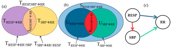 where I(:;:|:) denotes conditional mutual information, denotes the present state of RR, and , and represent the past states of RR, SBP and RESP, respectively. When the two sources are considered together, the information transferred toward RR from SBP and RESP (joint TE) is defined as