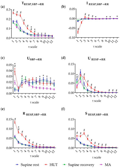A significant decrease of USBP→RR was observed also during MA over the last six scales (from 7 to 12, p ≤ 0.042). Moving from rest to HUT, the unique TE from RESP to RR decreased significantly at scale 1 (p < 0.001) and increased significantly at scales 3–6 (p ≤ 0.019) and 10–12 (p ≤ 0.048); during MA significantly lower values were found only at scale 1 (p = 0.031) (Figure 3d). The redundant TE from RESP, SBP to RR was higher at low scales (from 1 to 4, p < 0.001) and intermediate scales (from 5 to 7, p ≤ 0.014); during MA the significantly lower values were reached at scales 2, 8, and 9 (p ≤ 0.022) (Figure 3d). Finally, the synergistic TE was significantly higher during HUT almost across all time scales (from 1 to 9, p ≤ 0.008), while during MA no significant changes were found (0.949 ≥ p ≥ 0.141) (Figure 3f).