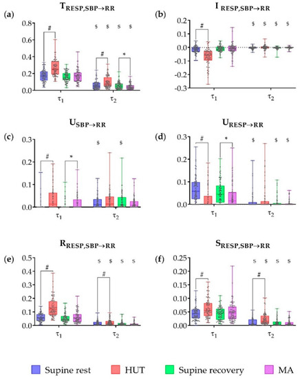 Multiscale information decomposition during the four phases of the experimental protocol (supine rest, HUT; supine recovery, MA) calculated for the scales representing raw data (τ1 = 1) and slower oscillations only (τ2). Plots depict the distributions (box plots and individual values) of (a) the joint TE (TRESP,SBP→RR), (b) the interaction TE (IRESP,SBP→RR), (c) the unique TE from SBP to RR (USBP→RR), (d) the unique TE from RESP to RR (URESP→RR), (e) the redundant TE (RRESP,SBP→RR) and (f) the synergistic TE (SRESP,SBP→RR). # Denotes statistically significant difference between the first and second phase (supine rest vs. HUT), *denotes statistically significant difference between the third and fourth phase (supine recovery vs. MA), and $ denotes statistically significant difference between raw data (τ1) and slower oscillations (τ2) during the same phase.