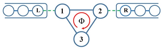 Model of the triangular system of three quantum dots (3QDs) threaded by the magnetic flux and attached to the left (L) and the right (R) electrodes.