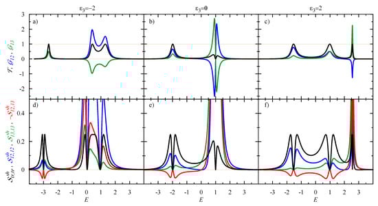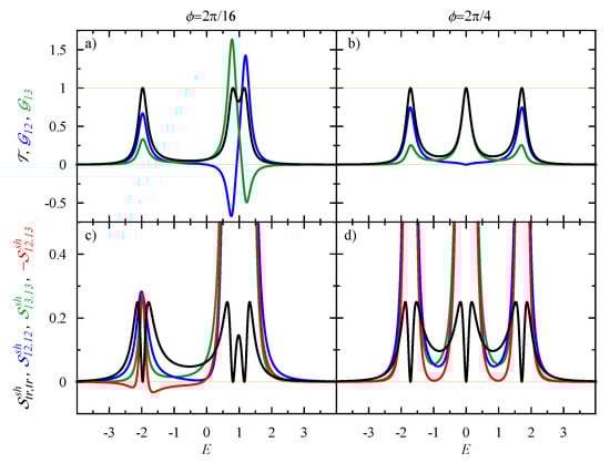 The lower panel of Figure 6 presents the spectral functions of the shot noise. According the Lesovik formula, at the resonant states (as ). This seems to be similar to the case presented in the lower panel in Figure 2. However, there is a great difference in the components of the shot noise , indicating the different nature of transport through these states and the role of quantum interference. Let us focus on the lowest resonant state, at , in Figure 6c, and compare with that in Figure 2e, in the absence of the flux. In the former case, the currents in both branches were uncorrelated, and . In the presence of the flux, quantum interference becomes relevant, which is seen in the shot noise (Figure 6c). Now, the currents in both branches are correlated; is negative close to resonance and fully compensates for the positive contributions and at resonance. For (see Figure 6d), all shot noise components are large, which indicates a strong quantum interference effect.