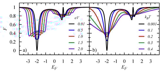The above analysis was performed under the assumption of a smooth energy dependence of the conductance in the small voltage limit and at . However, the conductances exhibit sharp resonant characteristics in the energy scale and, therefore, one can expect that these features will be smoothed out with an increase of voltage bias and temperature. Figure 3 presents the Fano factor , which is the ratio of the current correlation function to the net transport current, which was calculated numerically from Equations (17) and (26). At , one can observe the evolution from the coherent regime, from to in the sequential regime, for or . Quantum interference plays a crucial role at , leading to the Fano resonance for which the transmission and in the low voltage/temperature regime. An increase of the voltage/temperature results only in a small reduction of the Fano factor.