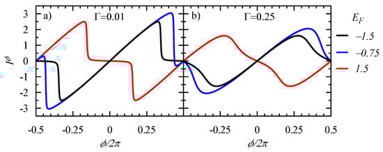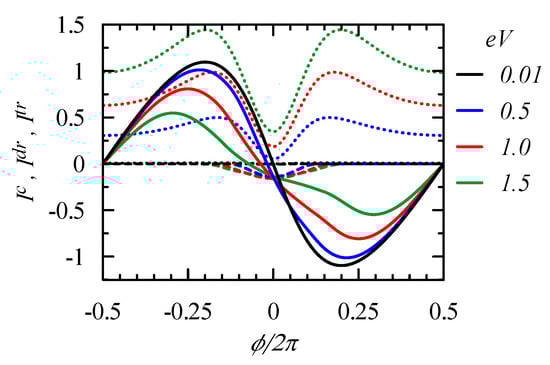 Note that Equation (6) includes the transport current due to the bias voltage applied to the electrodes, as well as the persistent current induced by the magnetic flux [a term proportional to ], which can be written as and , respectively. These coefficients are coupled with those in (7)–(10):