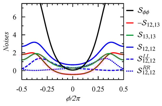 Figure 5 also shows (blue-dashed curve) and (blue-dotted curve), which correspond to the local fluctuations of the injected/ejected currents to/from the upper branch on the left and right junctions, respectively (see Equation (28)). The magnetic flux breaks the symmetry, inducing the persistent current and, therefore, the local conductances and are asymmetric.
