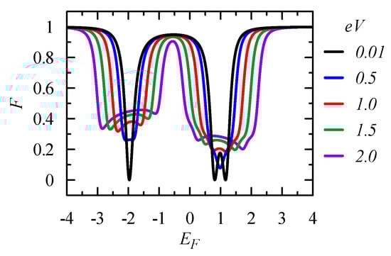 Figure 7 shows the Fano factor in the presence of the flux and for various bias voltages. Compared with the results in Figure 3 for , one can see how a small flux can destroy quantum interference and change electron transport. It is particularly seen close to , where the states with opposite chirality are located. In the case , one can observe the Fano resonance with a perfect destructive interference, and . With an increase of the flux , the Fano dip disappears, the two states are split, and transmission reaches its maximum value ; the Fano factor when the splitting . A similar effect was seen in the case of Figure 2, where a change of the position of the local level removed the state degeneracy and destroyed the Fano resonance.