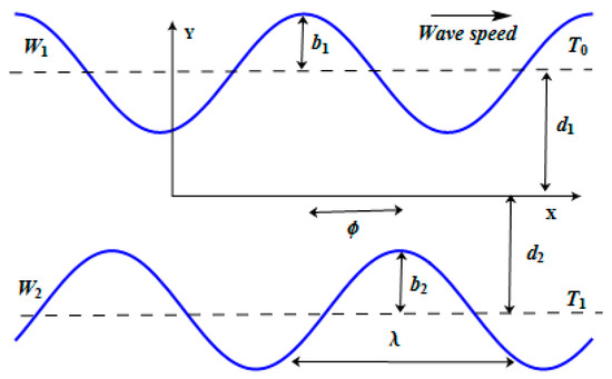 where represent the lower and upper walls, the amplitudes, the phase difference, the wave speed, the wavelength, and the time. The geometry of the flow problem is given in Figure 1.