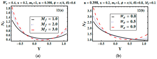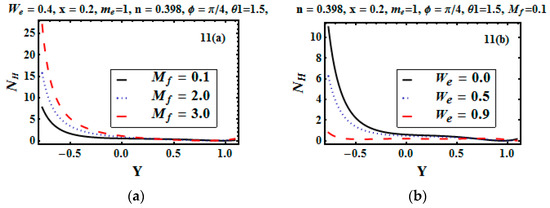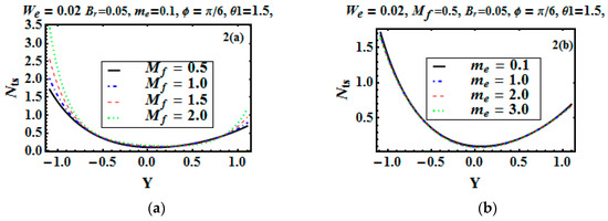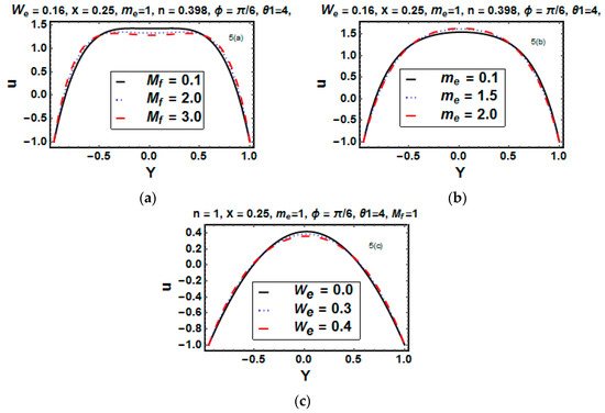 Axial velocity serves to provide salient feature of flow behavior. Figure 5a–c portrays the impact velocity profile in a channel with convective boundaries. We observed that the velocity formed a parabolic trajectory for physical parameters, and maximum velocity occurred at . Figure 5a portrays that the axial velocity decreased for the increasing value of the Hartman number. Since the Hartman number directly relates the magnetic force and this force is resistive in nature, therefore the velocity decreased. Figure 5b demonstrates the influence of the Hall parameter . Here, the velocity accelerated at the center of the channel while it reduced at the edges, the reasons behind this being that caused an upsurge of the electrical conductivity of the fluid; hence, the velocity increased. Figure 5c shows the comparison of viscous and Carreau fluids. It gained maximum velocity for a Newtonian fluid, while it reduced for the non-Newtonian Carreau fluid. Furthermore, it restored the symmetry about the center line.